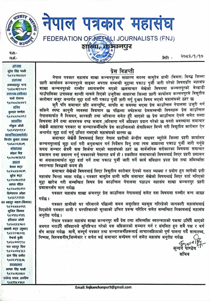 समाचार लेखेकै विषयलाई लिएर नेपाल प्रहरीको केन्द्रीय साइबर ब्यूरोले जिल्ला प्रहरी कार्यालय कञ्चनपुरलाई मुद्दा दर्ता गरी अनुसन्धान गर्न निर्देशन दिनु तथा त्यस आधारमा पक्राउ पुर्जी जारी गर्नुले समग्र सञ्चार क्षेत्रमै त्रास सिर्जना भएको महासंघको ठहर छ । सार्वजनिक सरोकारका विषयमा समाचार प्रकासन तथा प्रशारण गर्नु पत्रकारको पेशागत धर्म हो ।