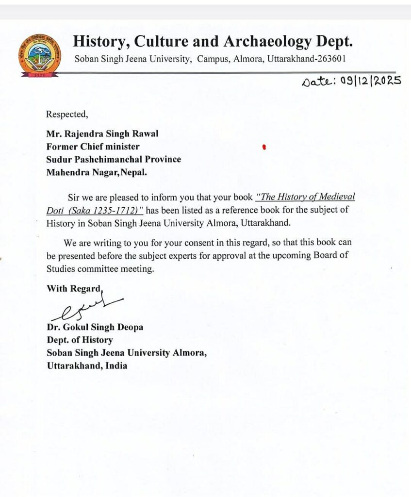महेन्द्रनगर – सुदूरपश्चिमका पूर्वमुख्यमन्त्री एव नेकपा एमालेका नेता राजेन्द्र सिंह रावलको ऐतिहासिक पुस्तक भारतको एसएसजे विश्वविद्यालयका विद्यार्थीहरुले अध्ययन गर्ने भएका छन् । एमाले पोलिटव्यूरो सदस्इ रावलको पुस्तक विश्वविद्यालयले पाठ्यक्रममा सूचीकृत गरेसंगै उक्त विश्वविद्यालयमा पढ्ने विद्यार्थीहरुले पढ्ने भएका हुन् । उत्तराखण्ड भारतको अल्मोडास्थीत शोबनसिह जिना युनिभर्सिटी (एएसजे)को ‘इतिहास, संस्कृति तथा पुरातत्त्व विभाग’ले रावलद्वारा लिखित पुस्तक ‘दी हिस्ट्री अफ मिडिभल डोटी (मध्यकालीन डोटीको इतिहास)’ लाई पाठ्यक्रममा राखेको छ । विभागका प्रमुख डा. गोकुल सिंह देउपाले पूर्व मुख्यमन्त्री रावललाई मंसिर २३ गते एक पत्र पठाउँदै उक्त पुस्तक विश्वविद्यालयको पाठ्यक्रममा राखिएको जानकारी दिएका छन् ।