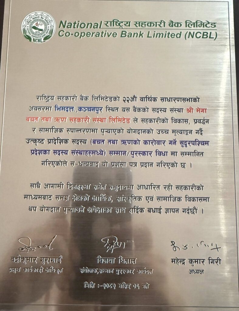 महेन्द्रनगर–कञ्चनपुर जिल्लामा रहेको मेगा सहकारी उत्कृष्ठ बचत तथा ऋण कारोवार गर्ने संस्थाकोरुपमा सम्मानित भएको छ । राष्ट्रिय सहकारी बैकले २२औ बार्षिक साधारण सभाको अवसरमा भीमदत्त नगरपालिका ३ महेन्द्रनगरमा रहेको मेगा बचत तथा ऋण सहकारी संस्था लिमिटेडलाई सुदूरपश्चिम प्रदेशमै बचत तथा ऋण कारोवार गर्ने संस्थाहरुमध्ये उत्कृष्ठ बचत तथा ऋण कारोवार गरेको भन्दै सम्मान पत्रका साथै पुरस्कृत गरेको हो ।