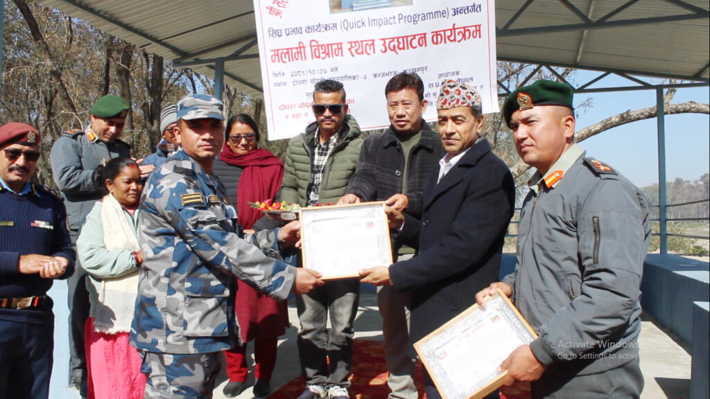 कार्यक्रममा मलामी बिश्राम स्थलमा निमार्ण कार्यमा सघाउने सशस्त्र प्रहरी जवानहरुलाई प्रमाण पत्र र दोसल्ला ओढाएर सम्मान गरिएको सशस्त्र प्रहरी बल नेपाल प्रस्तावित सिमा सुरक्षा गुल्म दोधारा चाँदनीले जनाएको छ् ।